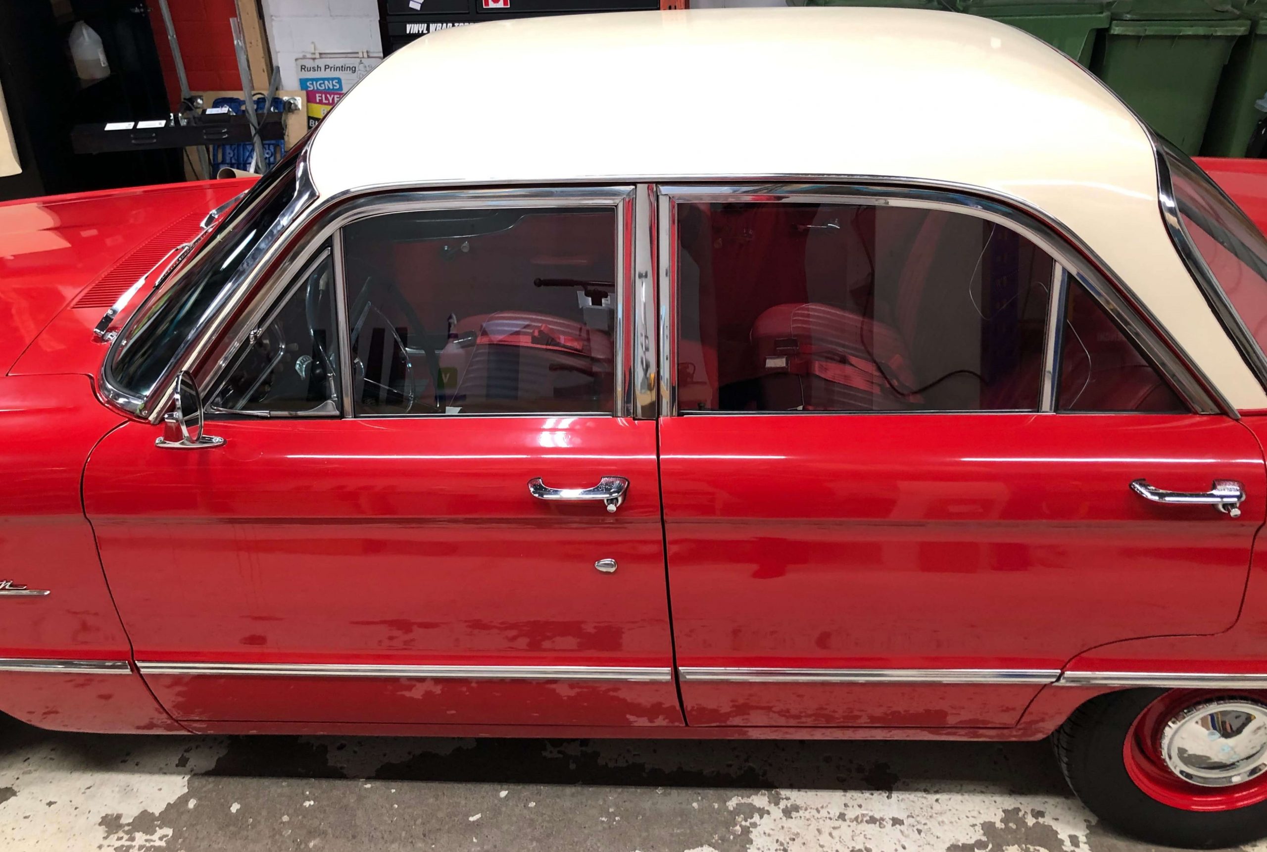 Need a trip back to the swinging ’60s. This 1962 Ford Falcon has been lovingly resorted by its current owner. The customer reached out to us at Vinyl Wrap Toronto to wrap his Ford Falcon Roof in Gloss Light Ivory. This is not the usual colour for us to use or wrap with, but the finish looks amazing. This car was painted Monte Carlo red originally when built, so the owner chose to restore it to its original specifications. We used 3M vinyl to wrap the roof, our installation crew has years of experience.